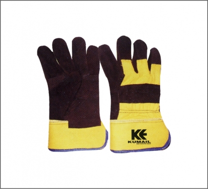 Material: Cowhide Brown Split Leather Gloves back Yellow Jeans cotton,Rubberized Safety Cuff. Option: Leather & Color Can Be Changed As Per Demand Packing: Poly Bag 12 Pair in Carton 120 Pair